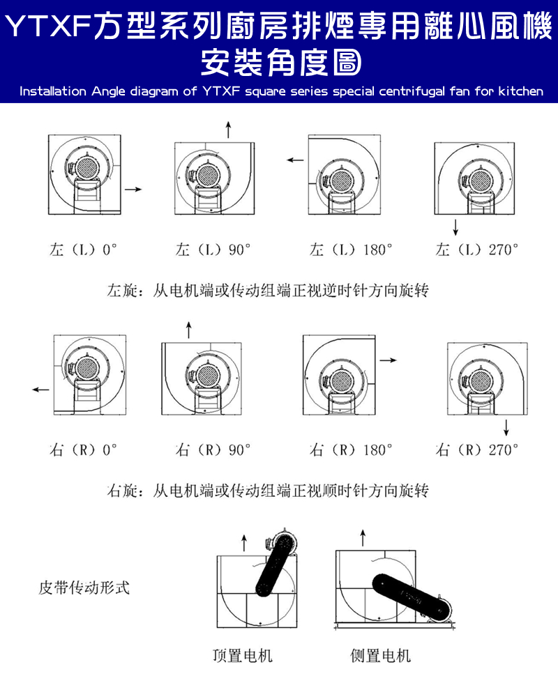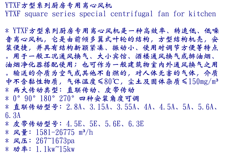 YTXF方型系列廚房排煙專用離心風機(皮帶傳動)高效率、轉速低、低噪音離心風機,它是由前傾多翼式葉輪的結構,方型結構機殼,安裝便捷